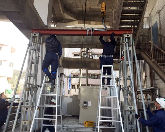 架空線があり、クレーン車で機械を少し揚重できても旋回や起伏できないために、クレーン車が旋回や起伏できる場所まで既設機械を移動できるように架台を組み立てます。
